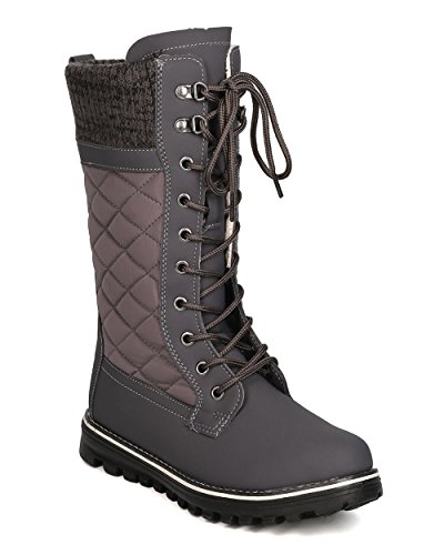 Refresh GB11 Women Mixed Media Mid-Calf Quilted Lace Up Winter Boot - Grey (Size: 8.0)